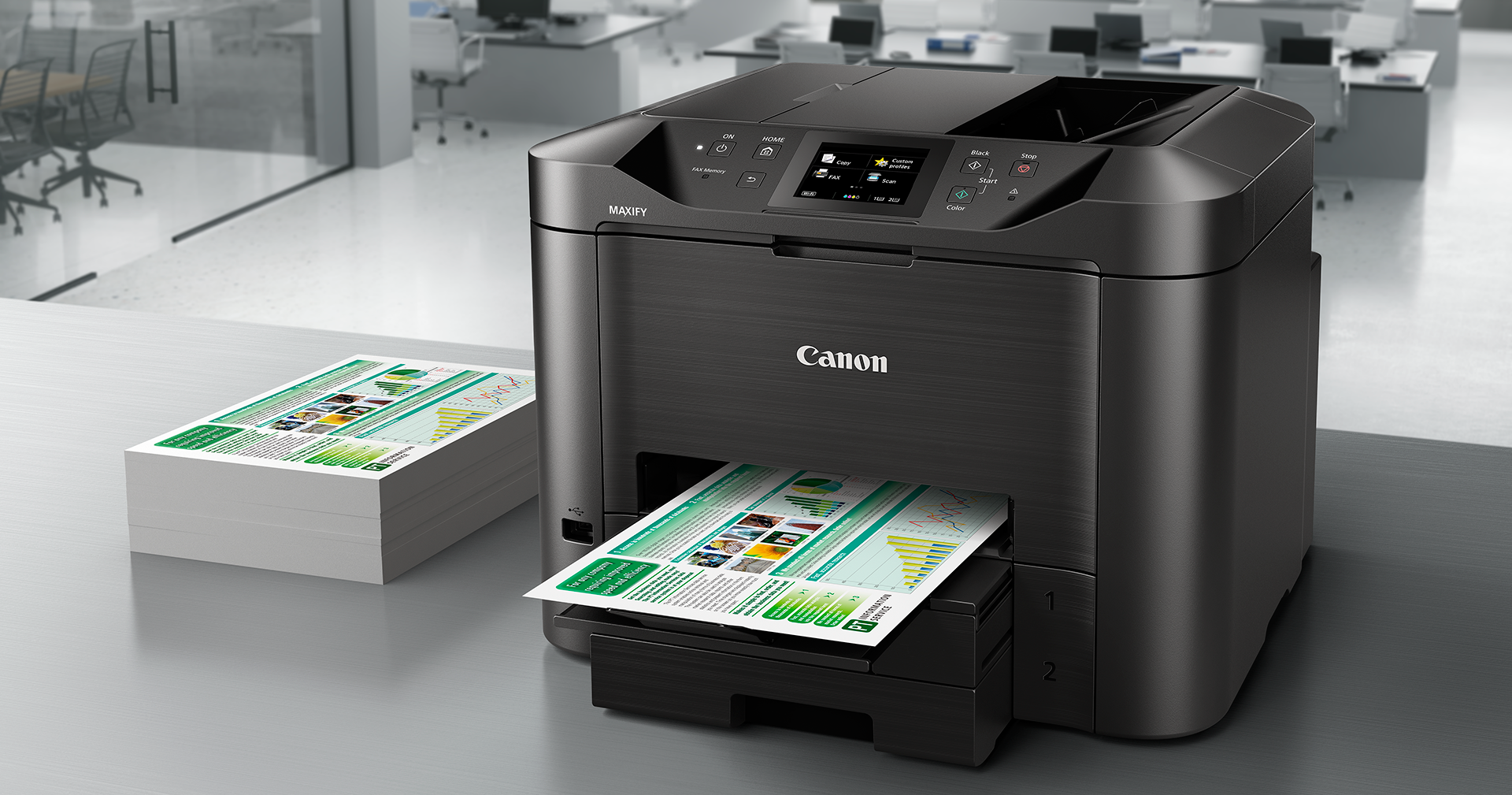 Топовый МФУ с ярким жидкокристаллическим дисплеем и возможностью автоматической двусторонней печати. Имеет максимальную скорость выдачи документов – до 33 листов в минуту. Главное преимущество модели – возможность дистанционного управления со смартфона или компьютера с помощью беспроводной сети.