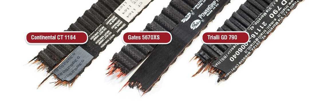 На новых ремнях среза зубьев не произошло: резина еще пластична, зуб просто деформируется и перескакивает. А вот у состаренных ремней на их «окрепших» зубьях происходит срез зуба — так и случилось у Continental CT 1164 и Trialli GD 790; у Gates 5670XS произошла деформация зуба, и он перескочил. По результатам теста видно, что все ремни имеют хороший запас прочности от среза (от 1,95 до 2,43 до старения и от 2,1 до 2,51 после старения). Самым устойчивым к срезу зуба оказался ремень ГРМ фирмы Trialli.
