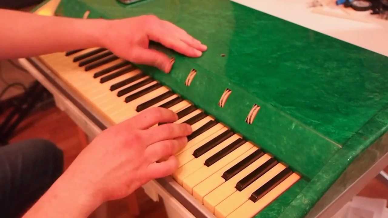В весьма упрощенном виде схема работы синтезатора представляет собой образование электрических сигналов путем замыкания контактов при нажатии клавиш. Полученные сигналы, после обработки на микросхемах или в микропроцессоре, преобразуются в звуковые волны, высота и тон которых меняются в зависимости от величины напряжения.