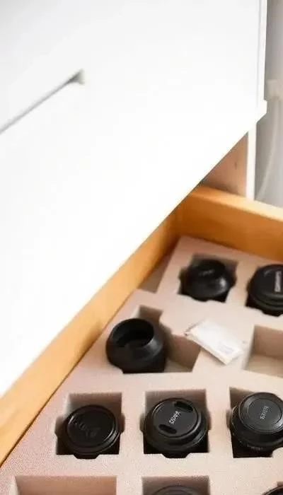 - На верхнем слое поролона разместите камеру и объективы так‚ как вы хотите их хранить․